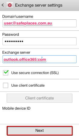 5. Enter only your email address in the Domain\Username section. Make sure your password is correct then add the following server in the Exchange server field: outlook.office365.com.